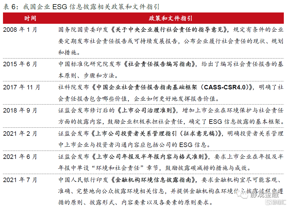 2021年,我国在企业ESG信息披露方面政策密集出台。目前我国对于企业ESG信息披露、企业ESG三方评估认证缺乏统一的详细要求。2021年“双碳”目标的推动下,我国相关政策制定取得较大进展,2月证监会发布《上市公司投资者关系管理指引(征求意见稿)》,明确投资者关系管理中上市企业与投资者沟通内容应包括公司的ESG信息;6月发布《上市公司年报及半年报内容与格式准则》要求上市企业在年报及半年报中单设“环境和社会责任”章节;7月人民银行印发《金融机构环境信息披露指南》;11月证券业协会发布《证券公司履行社会责任专项评价办法(试行)》。未来ESG信息披露制度不断完善将给ESG评级体系的发展提供极大助力。