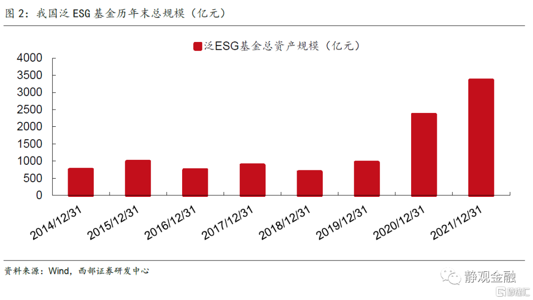 在此背景下,我国ESG资管规模在2020年以来快速上升,ESG基金加速发展。从基金数量上看,根据Wind数据,截至2021年12月31日我国一共成立了207只泛ESG投资基金,其中2020年、2021年分别成立了30只和66只。207只泛ESG基金中,基金名称含有“碳中和”、“ESG”、“可持续”、“低碳”、“环保”、“新能源”等明确字眼的基金共有123只。从基金资产规模上看,2020年末、2021年末我国泛ESG基金总资产规模分别为2361.7亿元、3357.2亿元,分别较前一年增长145.13%、42.16%。截至2021年末,基金名称中含有“碳中和”、“ESG”、“可持续”、“低碳”、“环保”、“新能源”等关键词的基金总资产共计1880.5亿元,较2020年末增长86.8%。