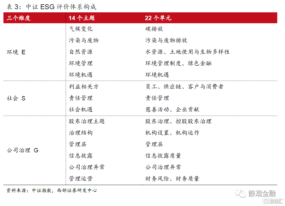 中证ESG评价体系覆盖在A股和港股上市的公司,更新频率一般为月频,发生严重风险事件时及时调整。中证ESG评价体系包括环境(E)、社会(S)、公司治理(G)三个维度,以及14个主题、22个单元和180余个指标。