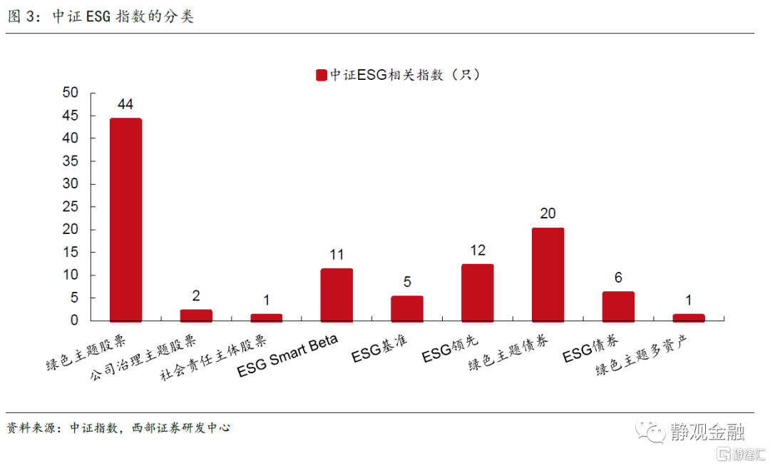 中证在ESG指数开发方面国内领先。2021年10月,中证指数成为境内首家ESG指数获得IOSCO准则鉴证的指数机构;截至2021年12月底累计发布ESG等可持续发展指数102条,如图3所示,包括75条股票指数、26条债券指数和1条多资产指数。但是和海外老牌机构相比差距较大,MSCI从1990年开始ESG指数开发,目前ESG相关的权益和固收指数共计1500余条,为全球投资提供参考。