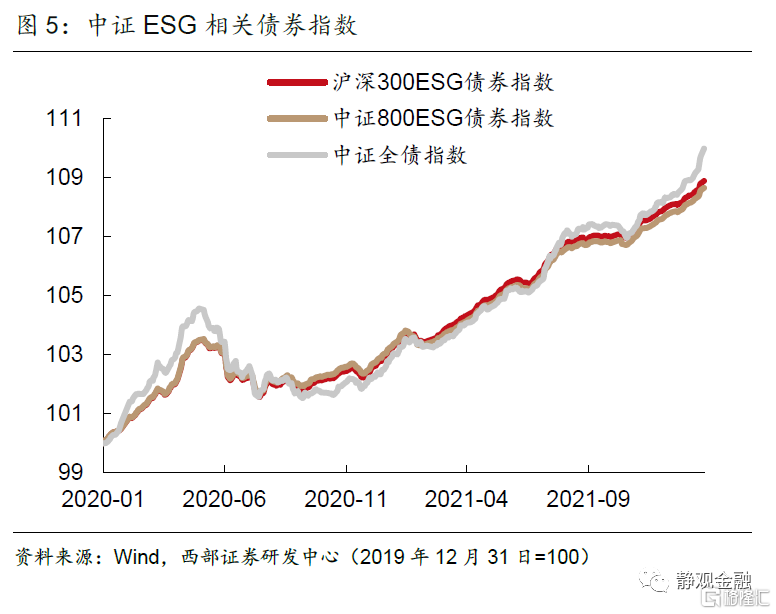 从中证ESG相关指数的市场表现来看,2020年至今中证ESG评级高的公司其股票收益率不及大盘平均水平。例如,沪深300ESG基准指数是从沪深300样本中剔除中证一级行业内ESG分数最低的20%的上市公司股票,剩余部分作为指数样本;其2020和2021年收益率分别为24.8%和-6.9%。沪深300ESG领先指数从沪深300指数样本股中选取ESG分数最高的100只上市公司股票作为样本,2020和2021年收益率分别为22.2%和-8.4%。相比之下,沪深300指数在2020和2021年分别上涨27.2%、下跌5.2%。除股票外,如图5所示,中证ESG评级高的主体所发行的债券,其收益表现也没有表现出明显优势。