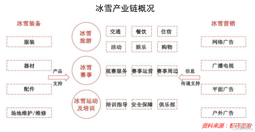 冰雪,既是大自然馈赠给人类的美好礼物,也是经济发展的重要资源禀赋。冰雪产业又叫“白色经济”,是指涵盖源于冰雪活动的相关产业,以及为冰雪旅游服务的各项经济活动,大体由冰雪旅游、冰雪赛事、冰雪运动培训、冰雪装备及其他相关领域的产品及服务组成。从产业链角度看,冰雪产业的上游涉及冰雪场地建设、冰雪装备及器材等,中游主要包括冰雪赛事服务、大众冰雪运动及培训、冰雪旅游等领域,下游则涵盖分销及营销渠道,最后到达参与冰雪产业活动的广大消费者。
