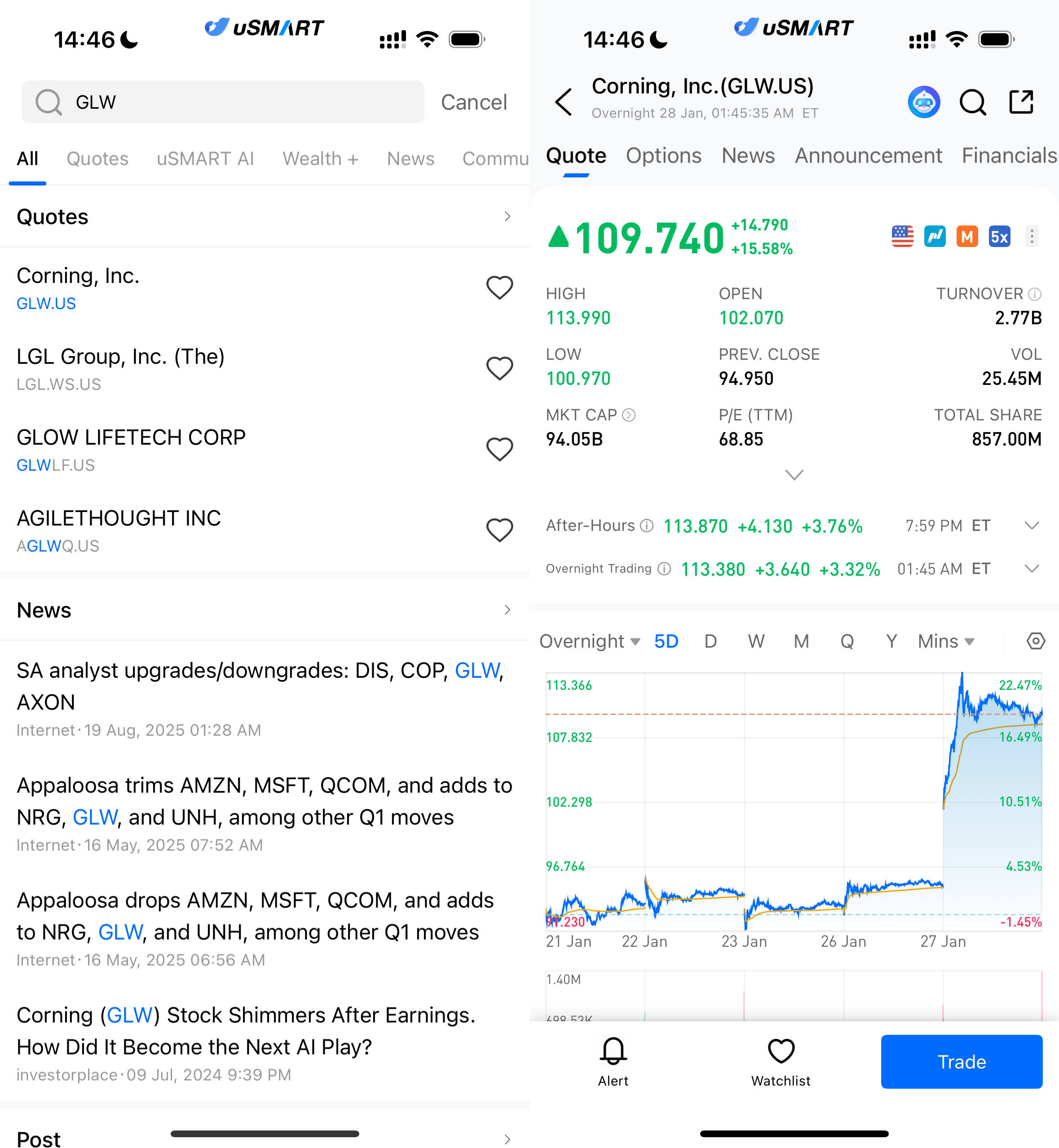 登入 uSMART HK APP 后,于页面最右上方点击「搜索」,输入标的代码(GLW.US)并进入详情页,了解交易详情与历史走势。点击右下角「交易」,选择交易类型,最后填写交易条件后送出订单即可。