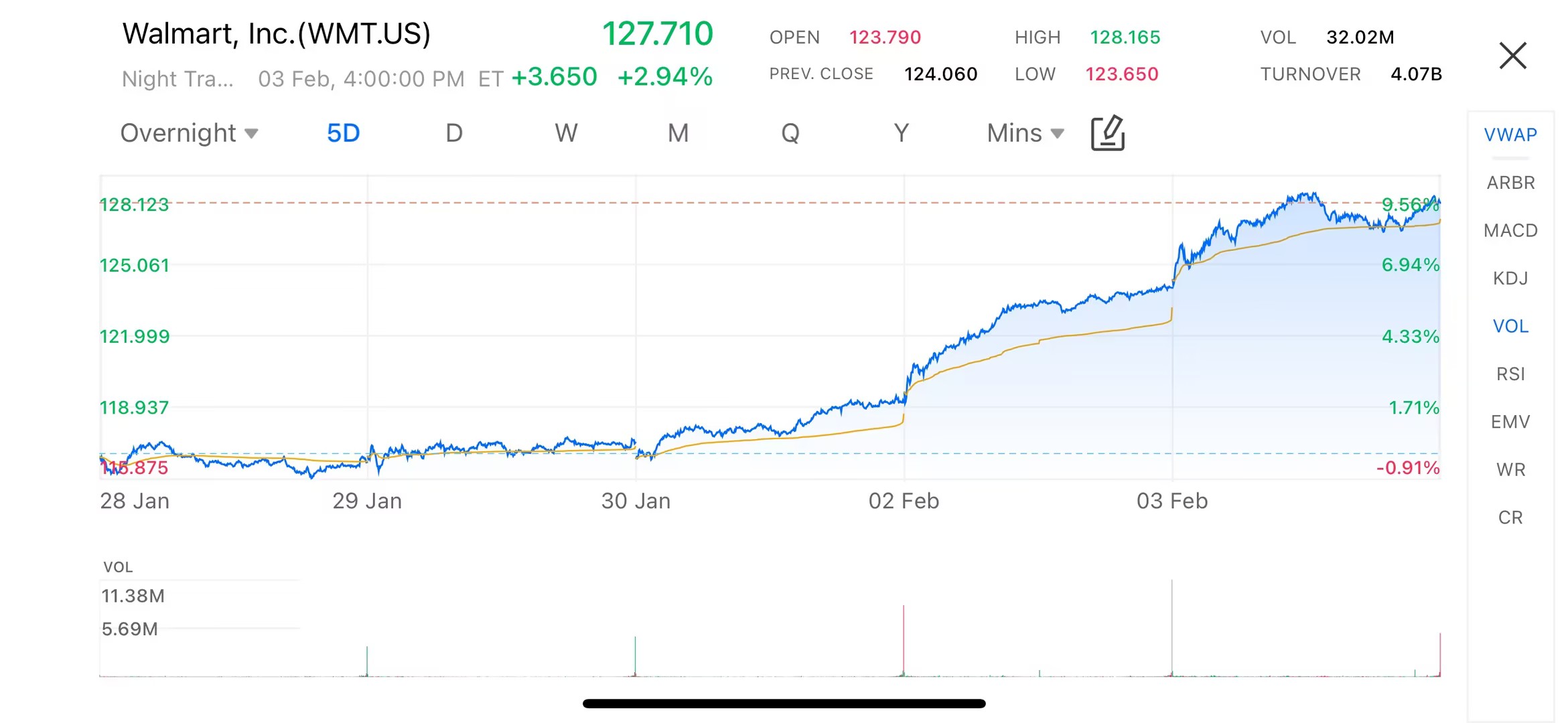 2026年2月3日,沃尔玛(WMT.US)股价大幅上涨3.65美元,收报127.71美元,涨幅达到2.94%。这一股价突破推动沃尔玛市值成功突破1万亿美元大关,成为继伯克希尔哈撒韦之后,第二家市值超过1万亿美元的非科技公司。