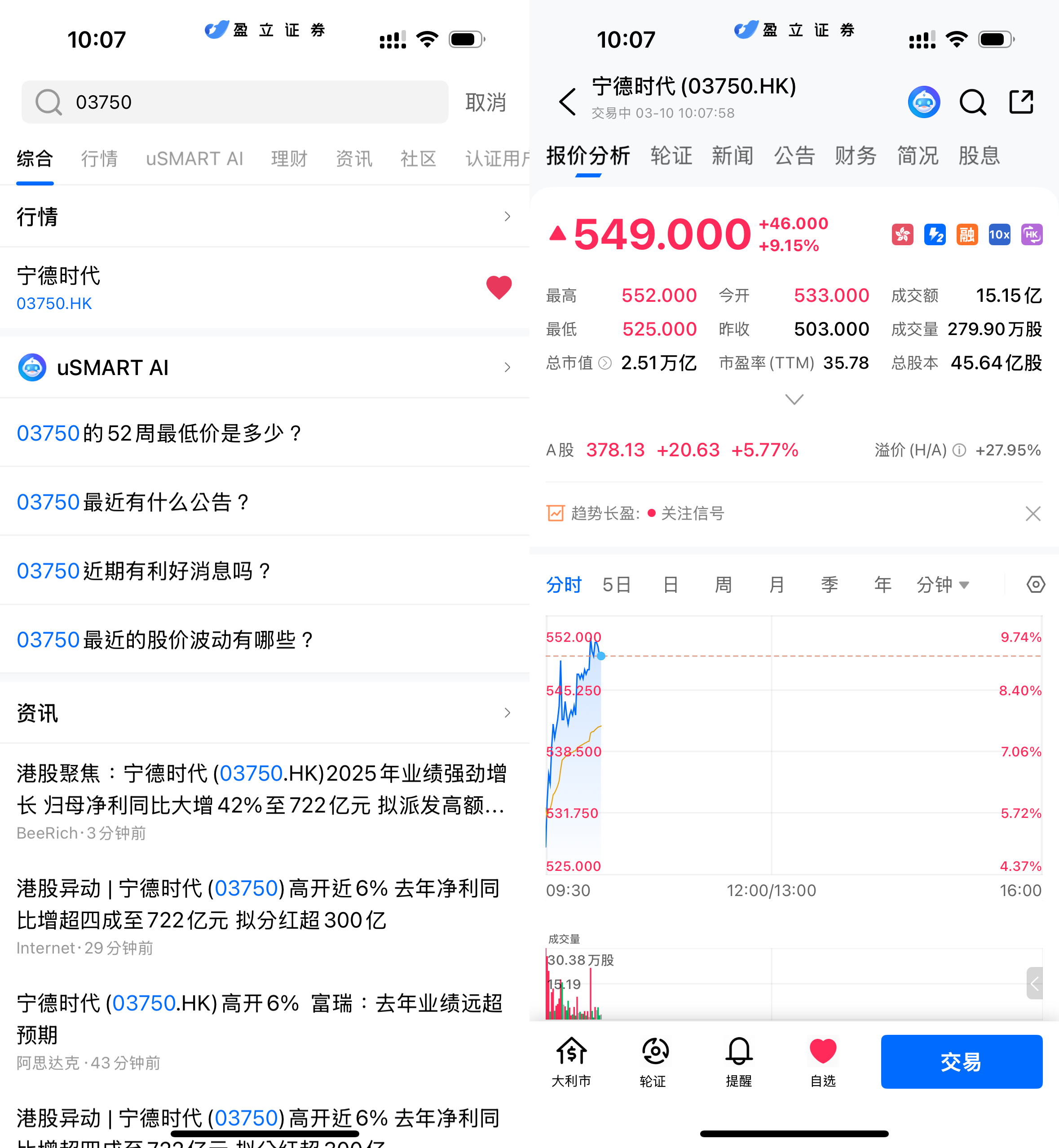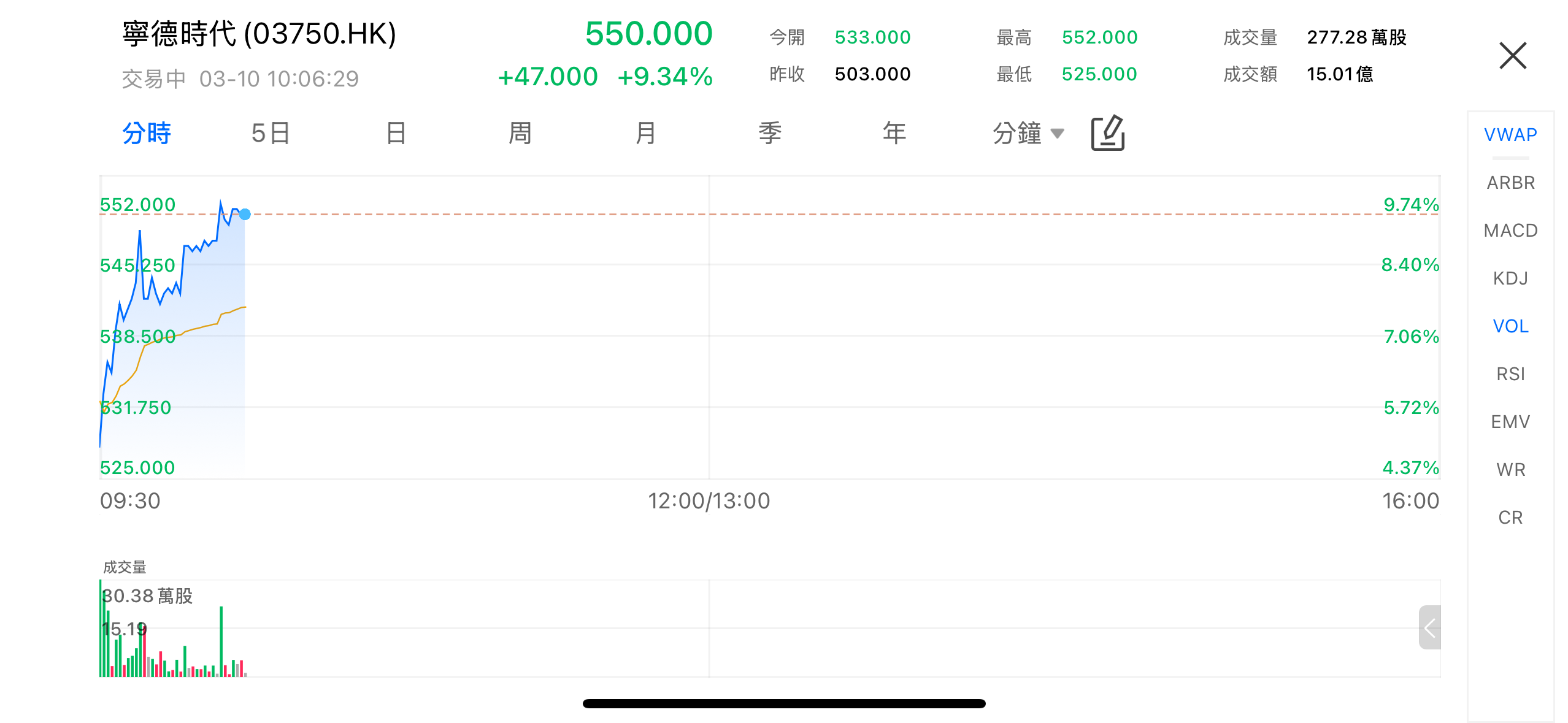 3月10日早盘,宁德时代(03750.HK)股价强势拉升,截至10:06,报550港元,涨幅9.34%,盘中一度触及552港元。成交量约277万股,显示出市场对公司最新财报的积极反应。投资者对其盈利能力和技术领先地位表现出浓厚兴趣,也反映出市场对动力电池及储能业务前景的信心。