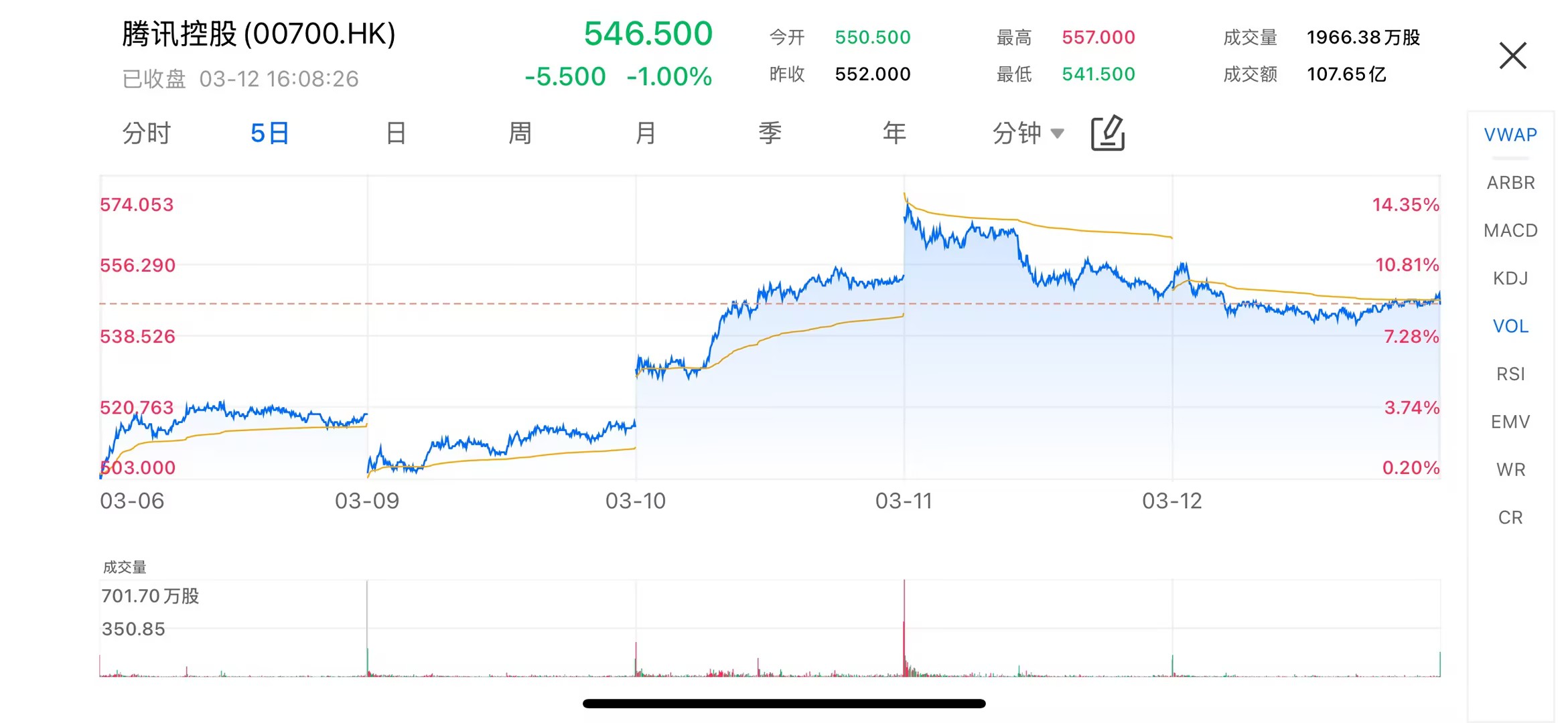3月12日收盘,腾讯控股(00700.HK)股价报 546.5港元,跌 1.0%,成交额约 107.65亿港元。从近期走势来看,腾讯股价在过去五个交易日自 500港元附近 持续上行,期间一度冲高至 578港元,阶段涨幅接近 15%。市场关注点集中在腾讯最新的AI布局,腾讯正为微信开发 AI智能体(AI Agent),若进展顺利,该功能有望在年中启动测试,并在三季度逐步向用户开放。