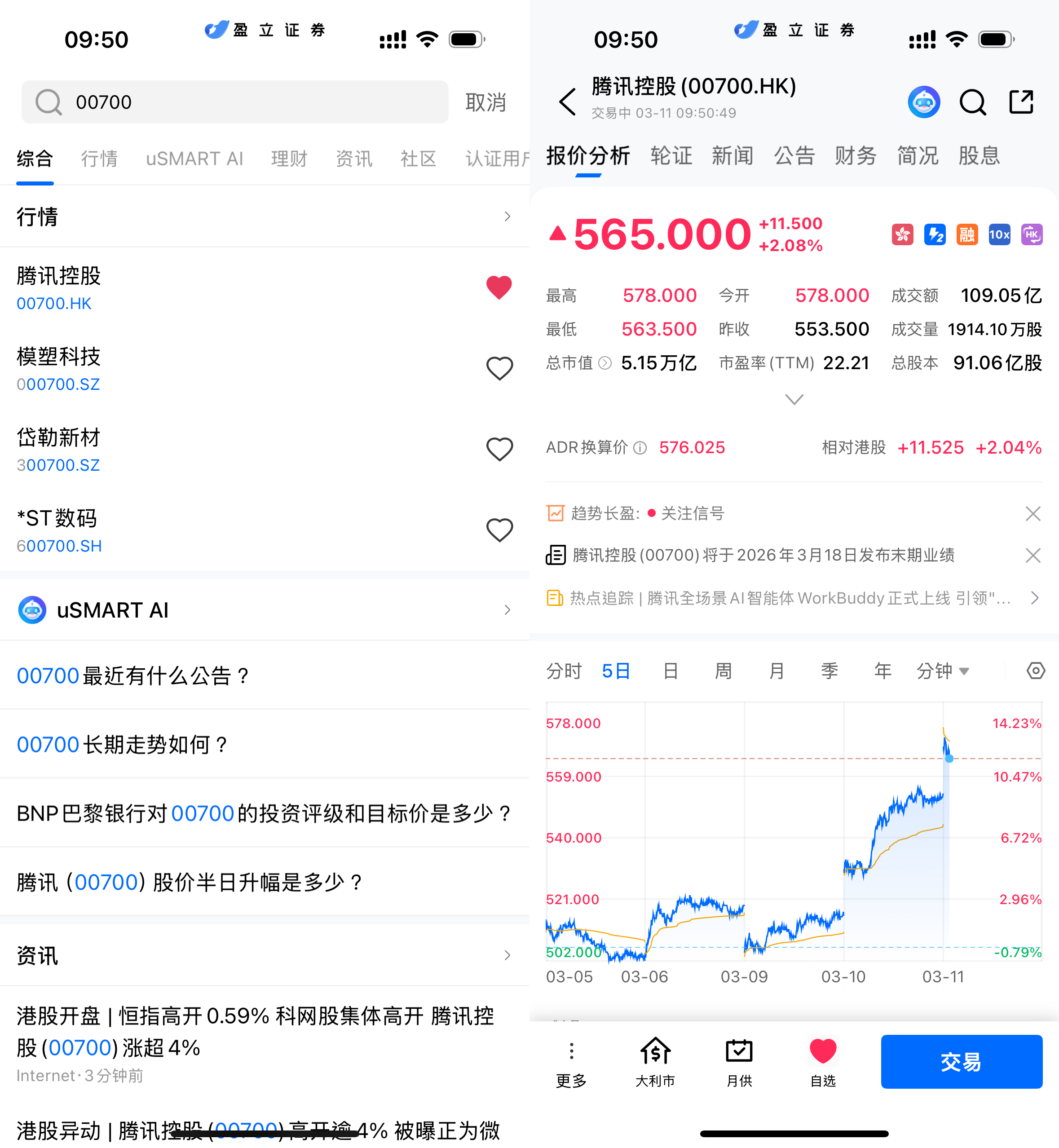 登入 uSMART HK APP 后,于页面最右上方点击「搜索」,输入标的代码(00700.HK)并进入详情页,了解交易详情与历史走势。点击右下角「交易」,选择交易类型,最后填写交易条件后送出订单即可。