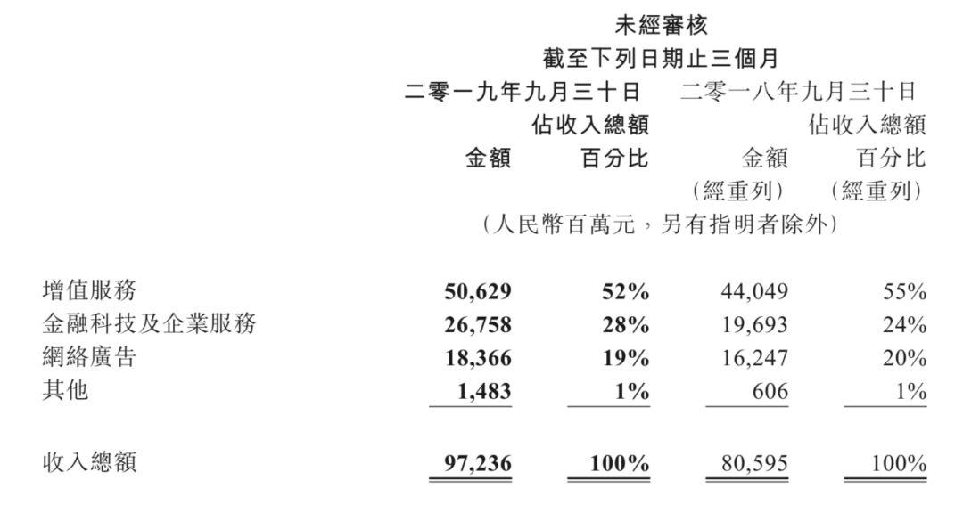 腾讯的收入由四部分构成,增值服务、金融科技及企业服务、网络广告、其他。