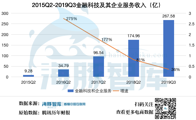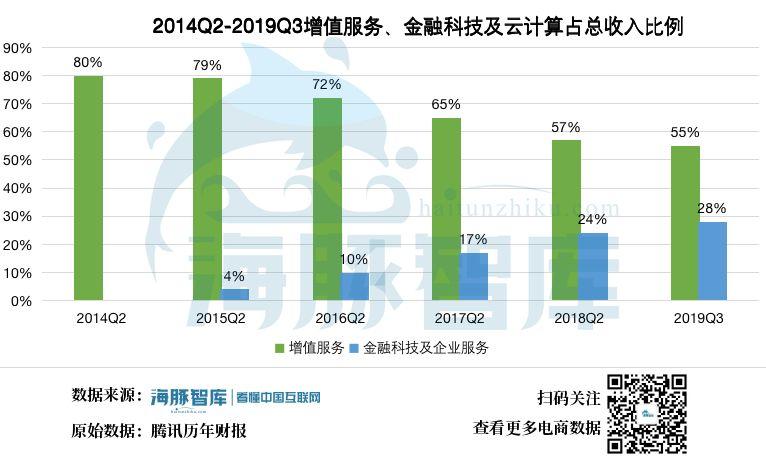 在这种情况下,腾讯依然没有抛弃游戏和大文娱,只是改变了投资策略。更注重原创研发和创新的能力。随着增值服务收入比例在整个收入中的不断降低,此时腾讯的第三架马车逐渐展露头脚,那就是金融科技及企业服务。
