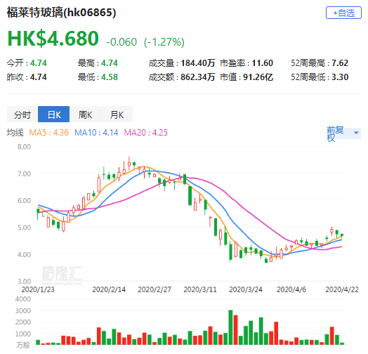 大和发表研究报告指,随着疫情降低海外对玻璃的需求,最近玻璃价格有所下降,料近期福莱特玻璃(6865.HK)毛利率将下跌至约30%,并认为于今年第一季录得高利润后,前景未见明朗,将目标价由5港元升至5.5港元,投资评级由“买入”降至“优于大市”。