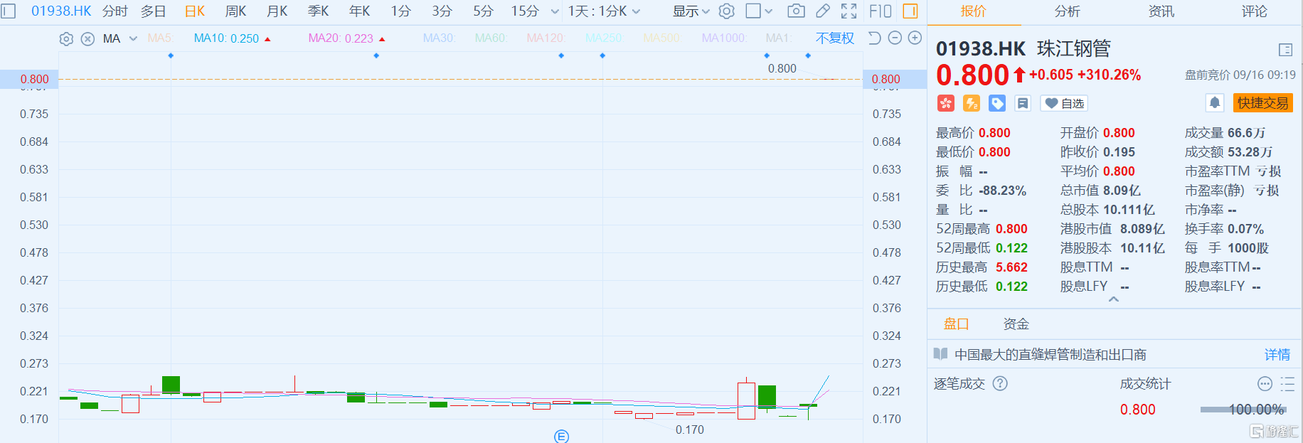 格隆汇9月16日丨珠江钢管(1938.HK)高开逾3.1倍,报0.8港元,股价创一年半以来新高,总市值8亿港元。