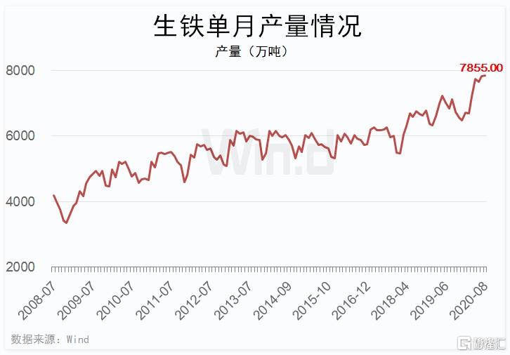 今年前8个月,生铁累计产量58940万吨,同比增速3.4%,产量创同期历史新高。