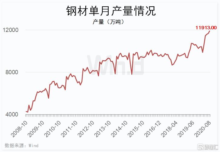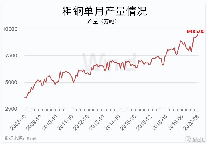 Wind数据梳理显示,8月份中国粗钢产量9485万吨,已连续两个月刷新单月历史新高,且单月产量已连续4个月超过9000万吨。