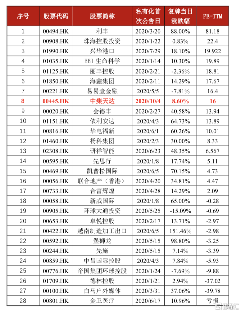 若以私有化报价所对应的最新估值高低来排名,中集天达的报价方案可在28个私有化公告案例中,排在第八位,也就是说,处于前三分之一份位的位置。从横向比较的角度,无疑这个报价是具备显著优势的。
