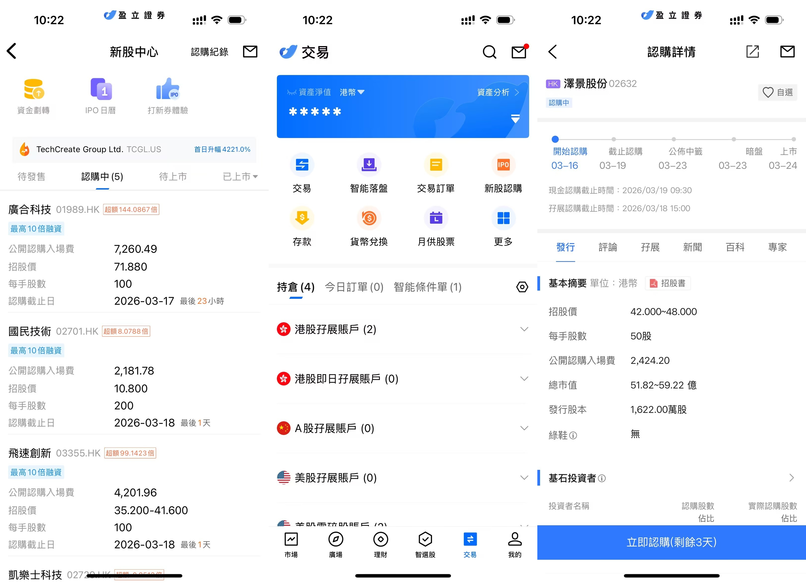 uSMART HK App 設有 IPO 中心,提供獨家優惠,客戶可在 App 即時認購公開發售之新股。登入 uSMART HK App 後,點選右下角「交易」,進入「新股認購」,選擇澤景股份後點擊「公開認購」,填寫認購數量並提交訂單即可。