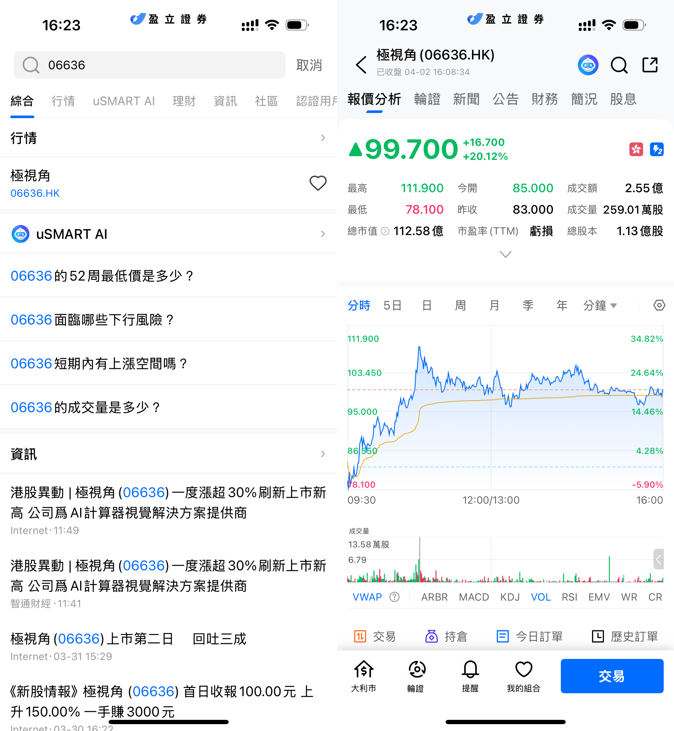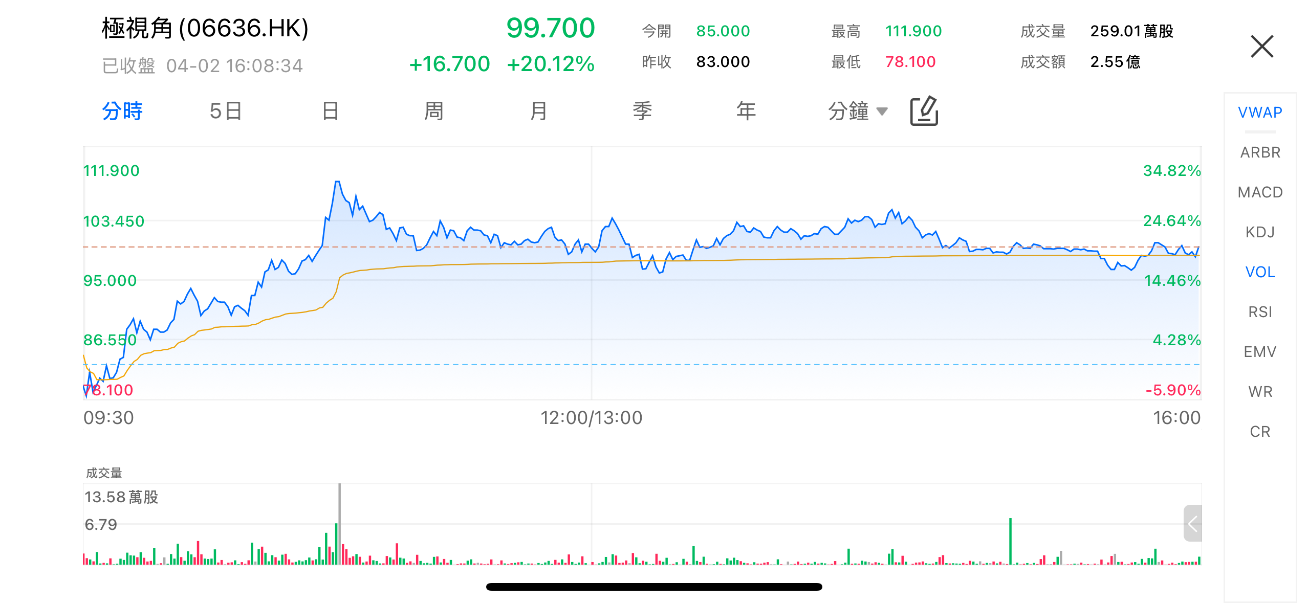 4月2日,極視角(06636.HK)收漲20.12%報99.7港元,盤中一度沖高至111.9港元,較招股以來低點顯著反彈。在整體市場表現偏弱的背景下,公司股價逆市走強,上市短短四個交易日累計漲幅已接近170%,資金關注度持續提升。