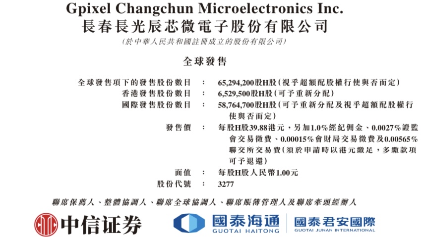 長光辰芯(Gpixel Changchun Microelectronics Inc., 03277.HK) 啟動香港IPO,招股期為2026年4月9日至4月14日,擬全球發售65,294,200股H股,並設15%超額配股權;每股發售價為39.88港元,每手100股,入場費約4,028.23港元;預期4月17日於聯交所主板掛牌,中信證券(香港)及國泰君安融資為聯席保薦人。