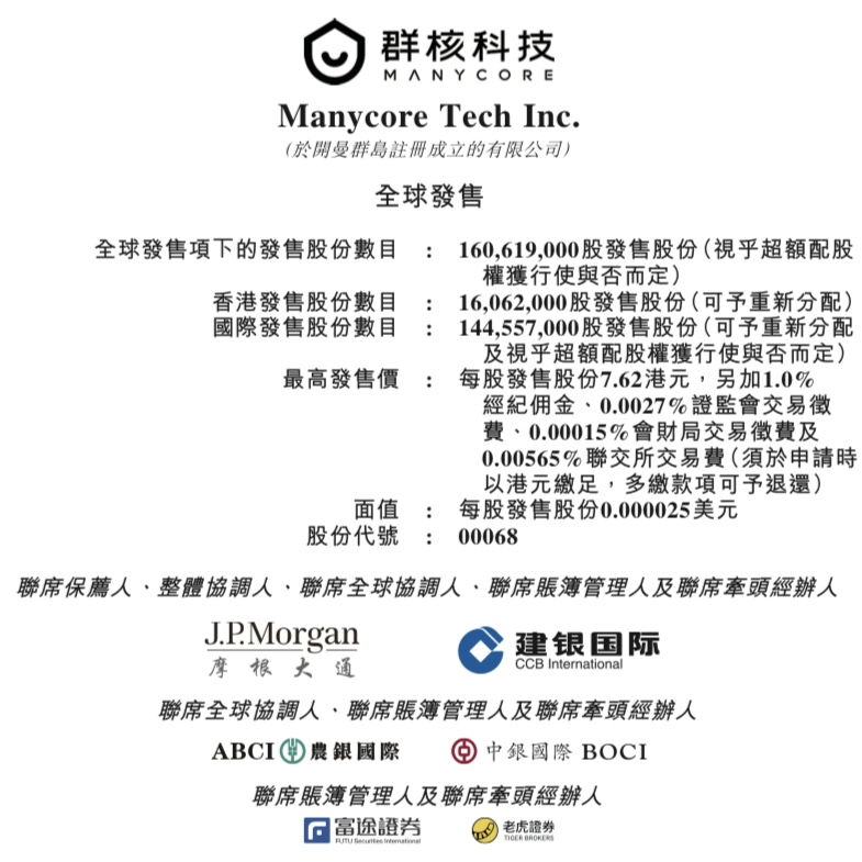 群核科技(Manycore Tech Inc., 00068.HK)啟動香港IPO,招股期為2026年4月9日至4月14日,擬全球發售約160,619,000股,並設15%超額配股權;每股發售價介乎6.72—7.62港元,每手500股,入場費約3,848.43港元;預期4月17日於聯交所主板掛牌,摩根大通及建銀國際為聯席保薦人。