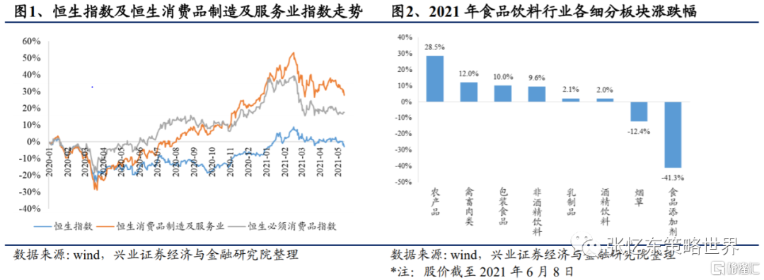 2021年,恆生食品飲料跑輸恆指整體表現。2020年新冠肺炎使得恆指及消費板塊均遭遇較大沖擊,全年恆指累計跌幅為4.60%。隨着新冠肺炎緩解,2021年港股行情逐步回温,2021年初至2021年6月8日恆指累計漲幅為4.8%;恆生消費指數累計漲幅為0.7%,恆生必須消費品指數累計跌幅達到6.9%。