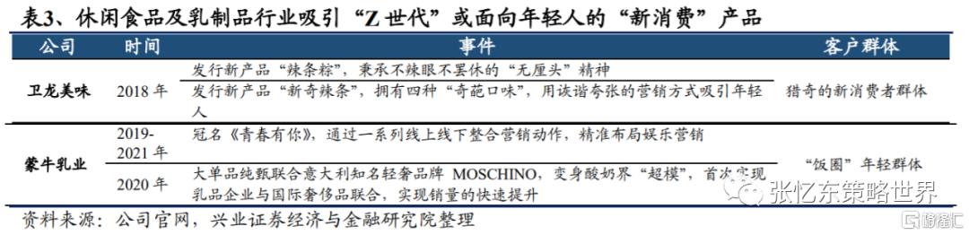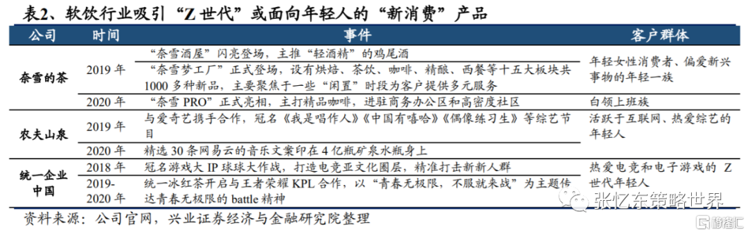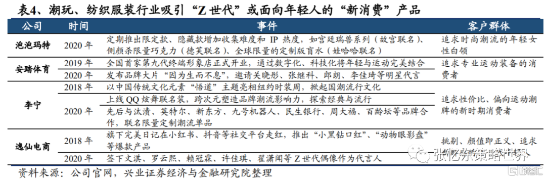 從主要上市公司佈局來看,吸引“Z世代”或面向年輕人的“新消費”產品層出不窮。“新消費”成為傳統行業龍頭的破局利器。相較於外資,內資品牌可以迅速切入“Z世代”圈層,推出符合其“買買買”心意的“新消費”品類。Z世代及小鎮青年為“圈層”買單的強烈表達欲助力國貨品牌升級、市佔率提升。潮玩泡泡瑪特、新式茶飲奈雪的茶、海倫斯小酒館、波司登、安踏等傳統紡織服裝企業追求設計及“潮”感迎合Z世代及小鎮青年,國潮崛起勢在必行。