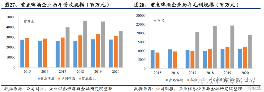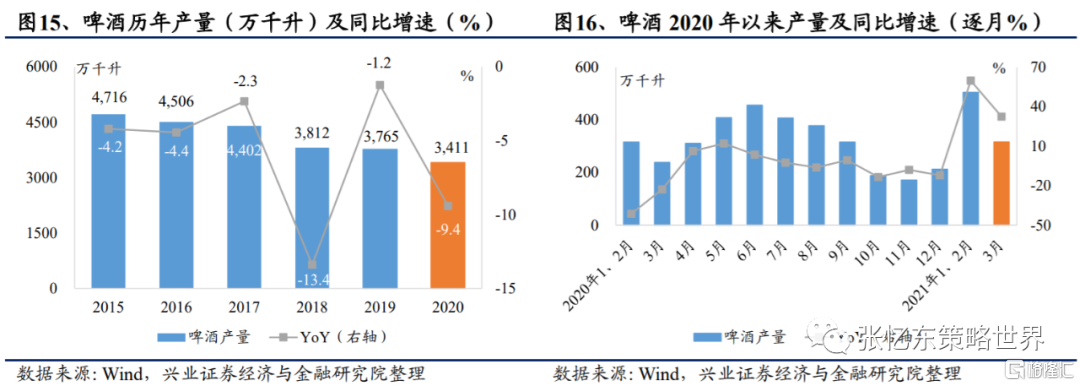 啤酒:1)、低基數背景下,啤酒行業2021Q1迎來強勢復甦,2021Q1產量同比提升50.7%。青島啤酒、百威亞太(全口徑)的2021Q1銷量分別同比+34.4%、+64.6%,銷量基本恢復至2019Q1水平。其中,百威亞太中國地區一季度銷量同比+84.6%。2)、包裝材料小幅漲價,預計啤酒企業將於2021Q2逐步體現成本壓力。3)、龍頭品牌“決戰高端”,品牌升級帶來確定性業績改善。近年啤酒企業量跌價升利潤漲成為普遍趨勢。根據興業證券海外研究團隊分析預測,以華潤啤酒為例,公司次高端以上產品銷量佔比13.2%,不及公司最大核心單品雪花的51.2%;但在銷售額方面,次高端及以上產品的銷售額超35%,超過雪花的29.6%,高端化戰略成效明顯。4)、“體育賽事+炎熱夏季”或將迎來鋪貨及動銷旺季。美洲盃歐洲盃(6、7月)、東京奧運會(7、8月)、男籃亞洲盃(8月)等大型體育賽事即將到來,2021Q2及2021Q3有望迎來鋪貨動銷旺季。