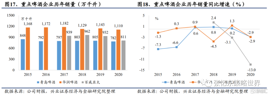 2021Q1重點啤酒企業銷量已恢復到疫情前水平。從已經公佈2021年第一季度報吿的重點啤酒企業來看,青島啤酒、百威亞太(全口徑)的2021Q1銷量分別同比+34.4%、+64.6%,銷量基本恢復至19Q1水平。其中,百威亞太中國地區復甦最為強勁,一季度銷量同比+84.6%。