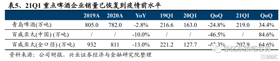 2.1、2021Q1重點啤酒企業銷量已恢復到疫情前水平