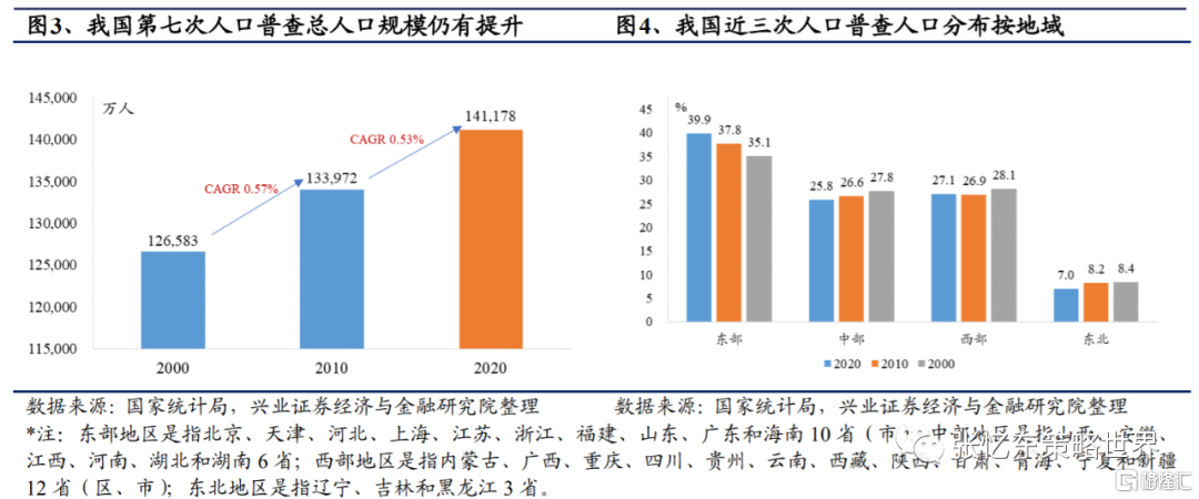 根據國家統計局近期發佈的第七次人口普查報吿,2020年,我國總人口規模14.2億人,較2010年第六次人口普查的13.4億人增長6.0%。從各地域分部來看,近三次人口普查結果顯示,東部地區是我國人口最集中地區,且中部、西部及東北地區人口呈現不斷向東部遷移的態勢。