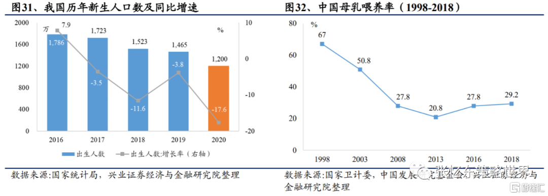 新生人口數數量下滑及未來母乳餵養率提升使得行業規模承壓。根據國家統計局數據,2020年我國新生人口數1200萬人,同比-17.6%,創20年新低。此外,為了實現《中國兒童發展綱要(2011-2020年)》和《國民營養計劃(2017-2030)》提出的50.0%純母乳餵養率的目標,2018年我國母乳餵養率為29.2%,較2013年提升8.4ppt。其中,大城市、中小城市和農村地區的母乳餵養率分別為35.6%、23.3%和28.3%。