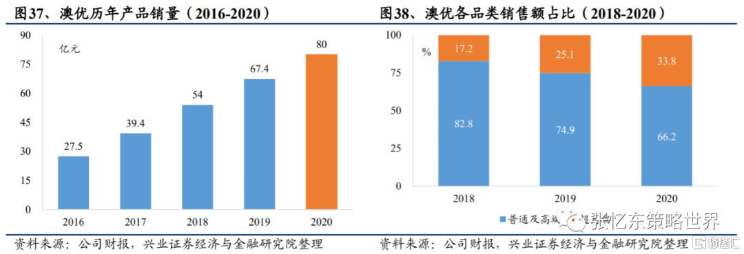 從行業整體看,2020年超高端及高端產品佔比共48.5%,銷售額同比+15.2%,2017-2020年CAGR高達27.7%。從公司來看,國內頭部奶粉企業順勢而為,通過研發工藝提升超高端及高端產品比重。2020年中國飛鶴的超高端及高端產品銷售額佔比分別為62%和15%,同比+2.1ppt、+0.6ppt;澳優的超高端產品銷售額佔比約為34%,同比+8.7ppt。從市場格局看,在超高端及高端產品上,國內嬰配粉頭部企業通過新品牌、新品類及新工藝,搶佔超高端與高端嬰配粉市場。伊利推出超高端金領冠珍護,飛鶴推出超高端超級星飛帆,澳優推出高端產品佳貝艾特和羊奶粉海普諾凱等。