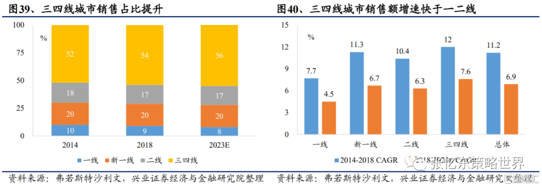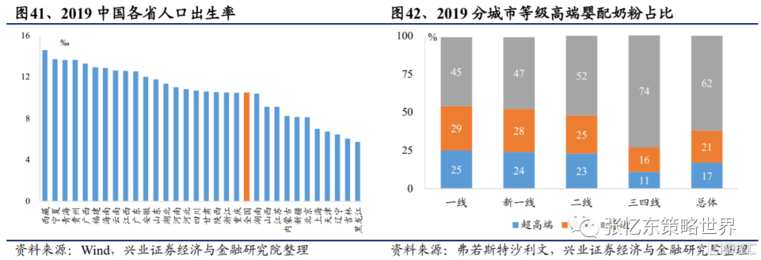 三線及以下市場嬰配粉需求大且增速快。2018年我國三、四線城市佔比54%,而一線、新一線、二線佔比分別為9%、20%、17%。近五年,三、四線城市嬰配奶粉複合增速高於一線和二線,三、四線複合增速為12%,而一線和二線分別為7.7%、10.4%。三、四線城市存在高消費空間。以前,由於中小品牌以低價長年包圍低線市場渠道,大品牌難以進入;以後,在奶粉註冊制度下,中小品牌關停,大品牌獲得新機遇。此外,隨着城鎮化率日趨提高,以及消費升級的必然趨勢,三、四線對超高端及高端嬰配粉的需求增加,也為大品牌提供新機會。根據弗若斯特沙利文數據,2019年三、四線市場超高端和高端奶粉佔比僅11%和16%,而普通奶粉佔比高達74%,未來低線市場渠道佈局是機遇。