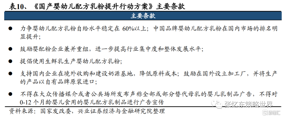 四是國家政策支持,利好國產奶粉品牌。政策硬性指標,提高嬰配奶粉自給率至60%以上。2019年6月,國家發改委等七部委發佈《國產嬰幼兒配方乳粉提升行動方案》,文件中提到力爭嬰幼兒配方乳粉自給水平穩定在60%以上。同時,在國家政策指引下,奶粉補貼、政府採購、列入社保等均利好國產奶粉。
