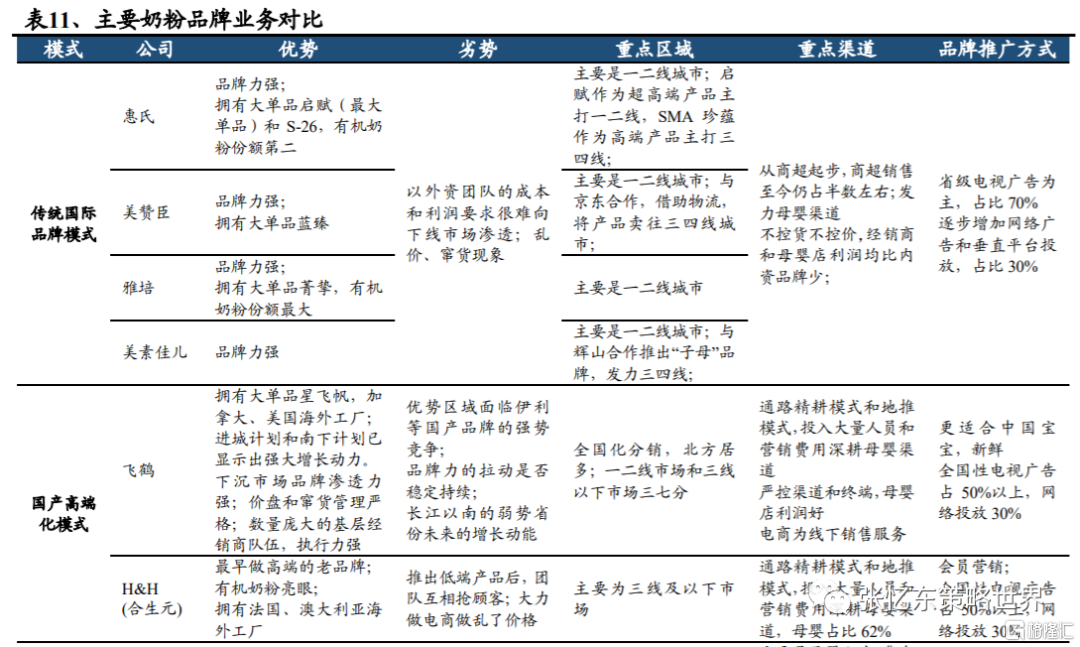 近年來,我國嬰配粉在母嬰店及線上渠道的銷售佔比持續增加,而傳統大型零售客户和小型商店銷售佔比明顯降低。根據尼爾森數據,2019年5月至2020年5月間我國嬰配粉在母嬰店、商超、電商的銷售佔比分別為68.8%、10.2%、21.0%,而此前在弗若斯特沙利文公佈的數據中顯示,2018年三者的銷售佔比分別為52.0%、30.0%、18.0%。我們認為,線上渠道銷售佔比的提升源於其便利性優勢。對比線下商超,母嬰店憑藉更為專業的一站式服務贏得更多客户的青睞,預計未來仍會持續擠壓傳統商超模式,是奶粉銷售的核心渠道。