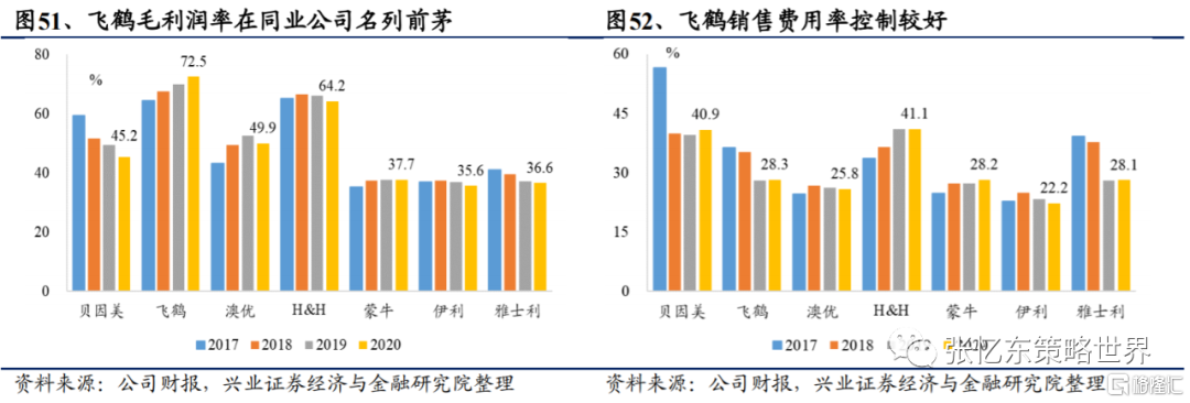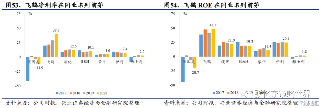 從財務角度看,飛鶴名列前茅。隨着產品結構升級戰略的實行,公司產品逐漸向高端化發展,高端產品持續放量。得益於高端產品較高的毛利水平,2020年中國飛鶴毛利率高達72.5%,同比+2.5ppt,淨利率為39.9%,同比+11.4ppt,均大幅領先於同業公司。除此之外,公司2020年ROE為48.3%,同比+6.5ppt,2017-2020年CAGR為5.6%,盈利能力持續增強。