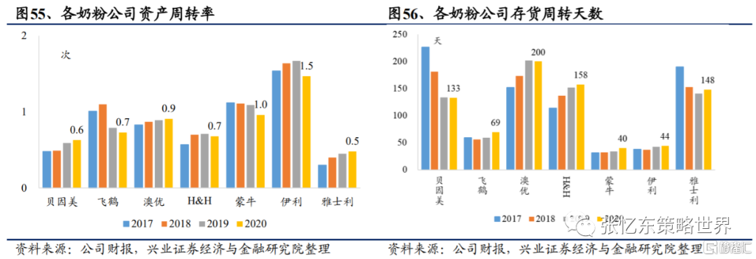 從運營效率看,飛鶴週轉較快。綜合性乳企週轉較嬰配奶粉公司快,這與產品快消品性質、渠道佈局完備有關。綜合性乳企資產週轉率更高,存貨週轉天數更低。從配方奶粉公司看,中國飛鶴週轉最快,2020年資產週轉率為1.5次/年,存貨週轉天數僅69天。