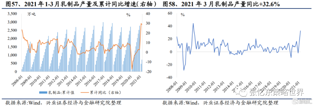 乳製品產量持續邊際改善,原奶價格提升。從產量看,乳製品產量在低基數下快速上行,2021Q1累計產量722噸,同比+28.9%,3月產量同比+32.6%;與2019Q1相比+11.2%,3月+14.0%。從價格看,原奶價格5月26日收於4.26元/kg,同比+19.7%。