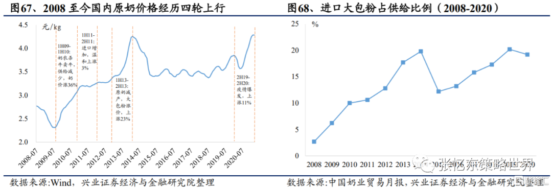原奶供給佔主導,價格週期上行。從供給來看,我國進口大包粉按1:8.5還原成液態奶後佔供應量的比例維持在10%-20%,原奶依然佔據供給主導地位。新冠疫情後,原奶價格持續上漲,對乳企有一定成本壓力。國內奶牛存欄量下降,進口奶牛採購成本提升,以及奶牛產能週期長,導致原奶供應成本上升。1)國內奶牛存欄量下降,2015-2018年國內奶牛存欄量逐年下降。2020年以來,牛結節病在福建、雲南、貴州、安徽相繼爆發,存欄量預計亦受到負面影響。2)進口奶牛採購成本上升,進口奶牛採購主要來自澳大利亞、新西蘭、烏拉圭、智利等。從採購數量看,2020全年進口奶牛採購數量約9萬頭。從採購價格看,平均採購價格從2020年初的1.2萬元/頭上漲至2021年3月的2.3萬元/頭,進口奶牛採購成本進一步提升。3)奶牛產能週期長,牛羣需要較長時間生長並釋放產能,且新增奶牛成長期較長,這為存欄量下降帶來連鎖反應。