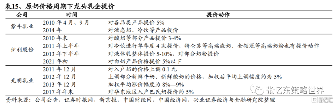 龍頭乳企對低温產品和基礎白奶提價,成本轉嫁能力強。2021年以來,伊利為應對原奶價格上漲,通過產品結構升級,對白奶等產品進行5%以下的提價;蒙牛則通過收窄終端促銷折扣,減少市場費用投放等進行“花式”提價。龍頭乳企上次大規模提價為2013年末,主要原因是原料成本大幅上漲造成成品供應緊張。由此可見,即使原奶成本上漲,龍頭乳企可通過提價轉嫁成本壓力,仍可保持較好的盈利水品,強者恆強。