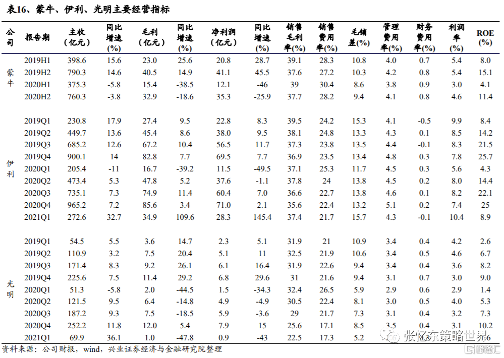 高端業務發力,龍頭毛銷差改善。蒙牛與伊利高端化趨勢持續,產品結構改善,高端產品發力,利好利潤釋放。蒙牛高端產品特侖蘇近兩年營收同比分別+20%和+19%,2020年特侖蘇營收佔比約26.3%,高端產品佔比超40%;伊利高端產品金典同比+20%,有機液體乳同比+35.1%,高端產品營收佔比超35%。除2020Q1疫情導致渠道受阻銷售費用普遍增加外,近三年蒙牛、伊利和光明的毛銷差均有改善,其中伊利顯著改善。