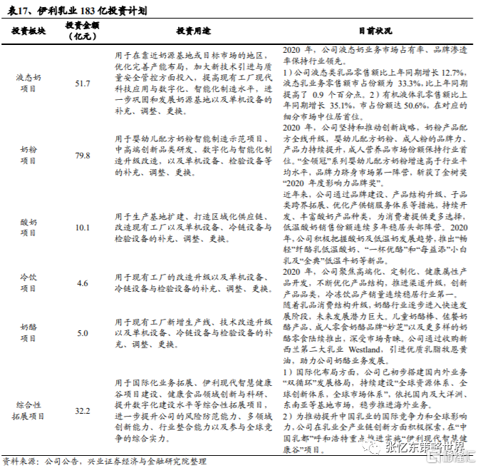 後疫情時代,居民對健康關注助推乳製品需求量。2020年2月8日,中國國家衞生健康委員會推出《新型冠狀病毒感染的肺炎防治營養膳食指導》,建議“普通型或康復期患者每天攝入300克的奶及奶製品(酸奶能提供腸道益生菌,可多選)”。同年2月26日,全國衞生產業企業管理協會、中國營養學會、中國奶業協會和中國乳製品工業協會亦共同發佈《中國居民奶及奶製品消費指導》,建議中國民眾每天攝入300克液態奶或相當於300克液態奶蛋白質含量的其他奶製品。疫情下,更多消費者選擇通過飲用乳製品改善身體狀況,健康、營養、蛋白質含量、新鮮成為消費者飲用牛奶的主要選購因素。2020年,行業液態奶的消費分級趨勢明顯,高端純牛奶、經濟型純牛奶需求強勁。2021年,伊利乳業將在液態奶、奶粉、酸奶、冷飲、奶酪和綜合性拓展項目投資183億元以提高產品品質、優化產品結構、提升品牌影響力和踐行各項發展戰略。我們預計,後疫情時代,乳製品需求增長勢頭未減,行業仍將保持增長。