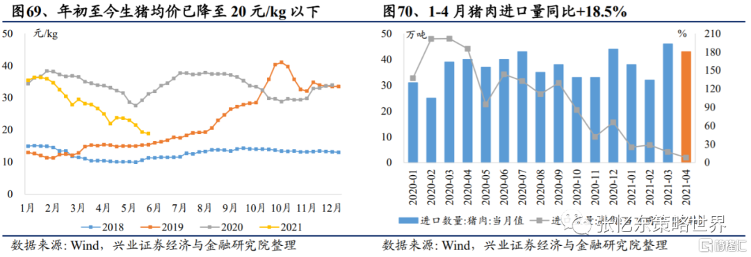 生豬存欄量2020年以來持續提升,全國生豬均價下探至20元/kg以下。據中國政府網及農業農村部公佈的數據,2021年3月份生豬存欄量同比增加29.5%,相比2020年12月同比增加2.3%。能繁母豬存欄同比增加27.7%,相比2020年12月同比增加3.8%。全國生豬5月28日最新均價為18.56元/kg,年初至今下跌47.6%。此外國內肉製品企業進口豬肉量攀升,1-4月進口量達156.2萬噸,同比+18.5%。