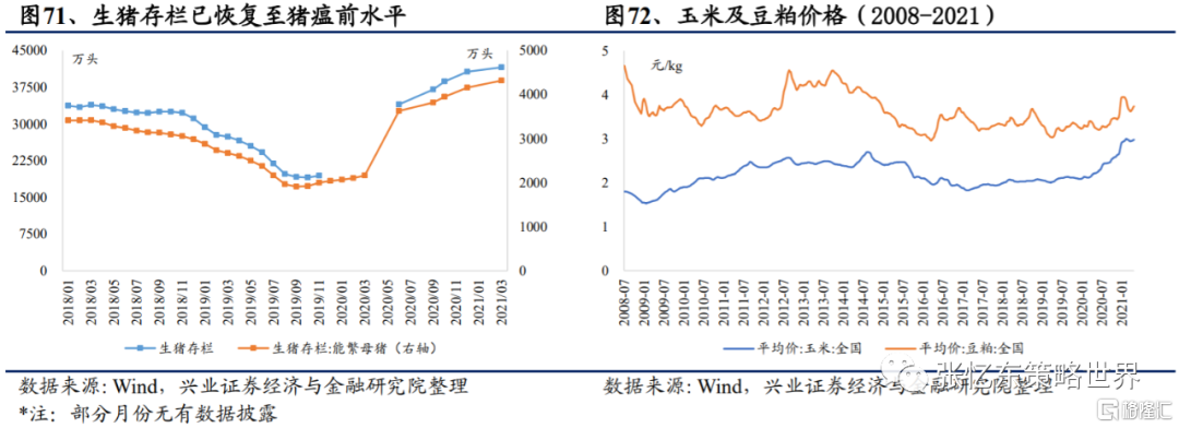 預計2021年豬價整體偏弱震盪,三季度豬價有所回升。從生豬養殖行業的供需關係來看,國內人均豬肉消費量穩定的背景下隨着生豬存欄量和出欄量的持續回暖,預計2021年豬肉價格整體震盪下行。由於去年冬季以來疫情比較嚴重,散户受到恐慌情緒的影響,會將小體重豬提前投入市場,也打壓了豬價。但預計前期疫情導致的仔豬和母豬的缺失還是會體現,再疊加消費回暖,我們初步判斷三季度豬價有回升的可能。