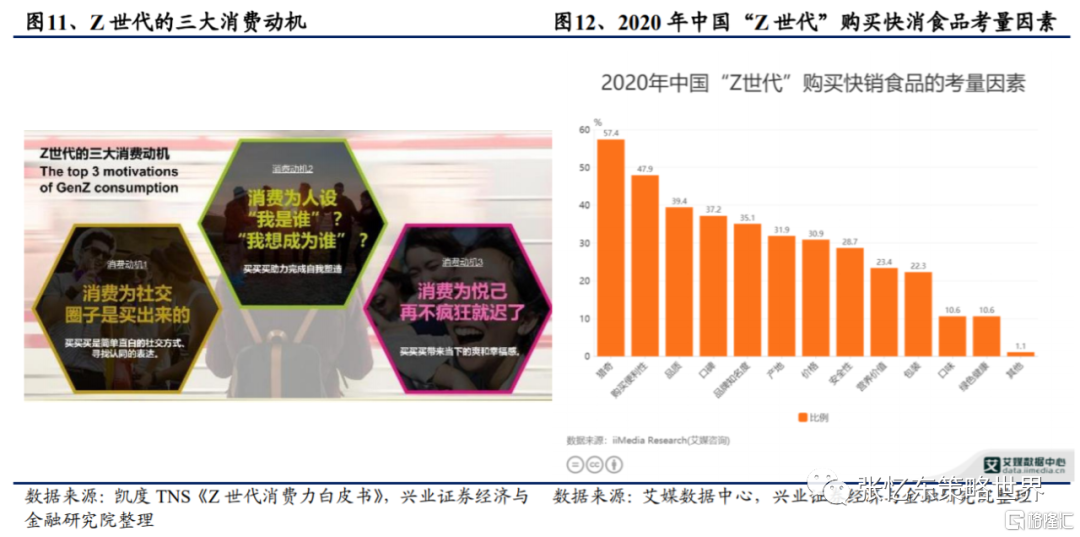 《Z世代消費力白皮書》提出,Z世代消費具有明顯的三大動機:(1)消費為社交,圈子是買出來的,“買買買”是簡單直白的社交方式,尋找認同的表達。(2)消費為人設,“我想成為誰”、“我是誰”,“買買買”助力完成自我塑造。(3)消費為悦己,“買買買”帶來當下的爽和幸福感。據艾媒數據中心數據,2020年中國“Z世代”購買快消食品考量因素中,獵奇、購買便利性及品質影響因素最大,分別為57.4%、47.9%及39.4%。其對於口味的考量因素佔比僅為10.6%,符合Z世代的消費動機——即為圈子、人設及悦己買單。