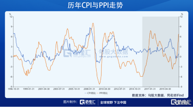 理論上,PPI作為上游,與CPI的走勢應該是趨同或是較強相關的,週期也會比較明顯。然而從歷年數據來看,中國CPI與PPI的幾輪小週期中,有些年份走勢一致,有些年份則是明顯的背離。