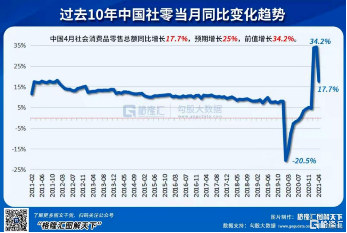 而目前經濟復甦進程也不及預期,從中國社零數據也可以看出來,4月消費同比增長17.7%,而預期是增長25%,上月消費就已經開始不及市場預期了。