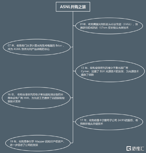 打通上下游產業鏈,形成穩定利益共同體;藉助戰略併購,構建完整上游供應鏈,快速攫取技術領先優勢。ASML 一方面通過給予客户優先供貨權,吸引客户(英特爾、三星、台積電)注資入股,既可快速掌握市場需求,也降低研發風險;另一方面通過不斷的戰略併購,打通上游供應鏈,直接獲取成熟的反射鏡頭光學、EUV光源、電子束晶圓檢測、微影鏡頭等技術領先優勢,在保障光刻機質量的同時,還促進了公司技術的創新,使得公司能夠快速搶佔市場份額。