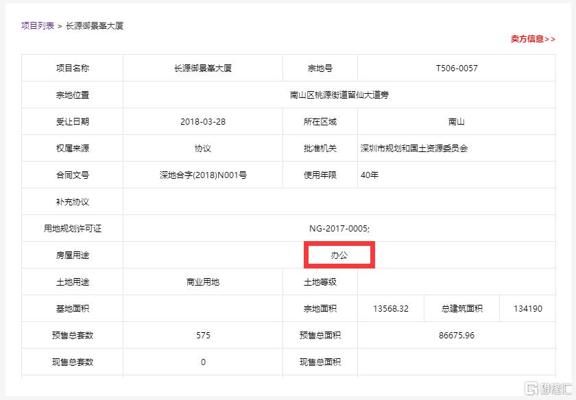據深圳市住建局數據,京基御景峯分三期拿預售,目前在售的是第三期項目,備案名爲長源御景峯大廈,位於項目1座、2座和3座,產權40年房屋用途爲“辦公”