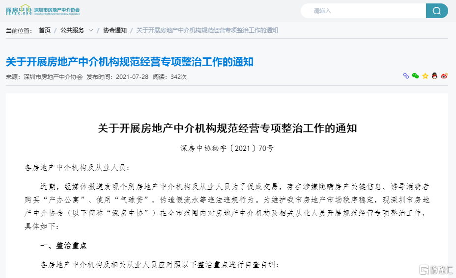 爲維護深圳市房地產市場秩序穩定,現深圳市房地產中介協會在全市範圍內對房地產中介機構及相關從業人員開展規範經營專項整治工作。