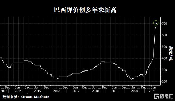 近10年,全球食物需求增長推動糧食產量增長了25%,去年糧價上漲刺激農民擴大種植面積,化肥需求量增長。巴西和美國鉀現貨價格創至少8年來新高。