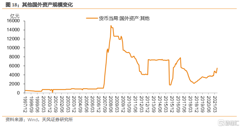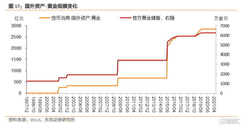 黃金科目記錄的是央行從國內或國際黃金市場爲購入黃金而投放的人民幣數量。其在國外資產科目中佔比非常小。黃金規模在2001-2021年間出現的幾次躍升,均與央行增持黃金儲備的操作相對應。